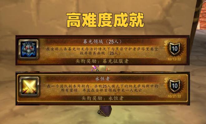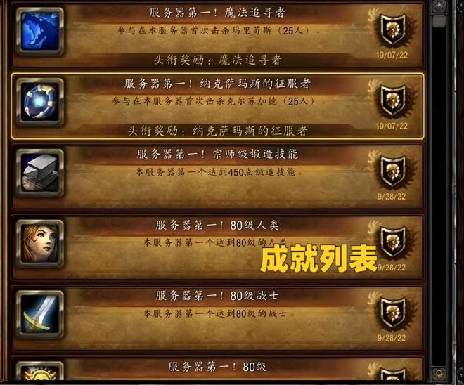 这是国服某服务器联盟战士玩家的成就清单。服务器第一就有六个成就。包括三个升级成就、一个专业成就和两个副本第一杀戮成就。除了六个服务器的第一个成就,战士玩家还有两个普通玩家无法企及的成就,分别是25人和3人+1黑龙和25人NAXX永恒者。战士的3+1黑龙是在团本开放第二周完成的,当时很多公会团打了2个团+1都很难,野团甚至只能打1+1,甚至是0+1的便当黑龙。25人NAXX永恒的成就也很难获得,这需要所有的成就BOSS没有玩家在战斗中倒下。许多玩家甚至没有完成10个不朽的成就,更不用说25个永恒的成就了,毕竟很难找到25个完全不犯错误的玩家,更不用说经常出人意料的成就终结者了。