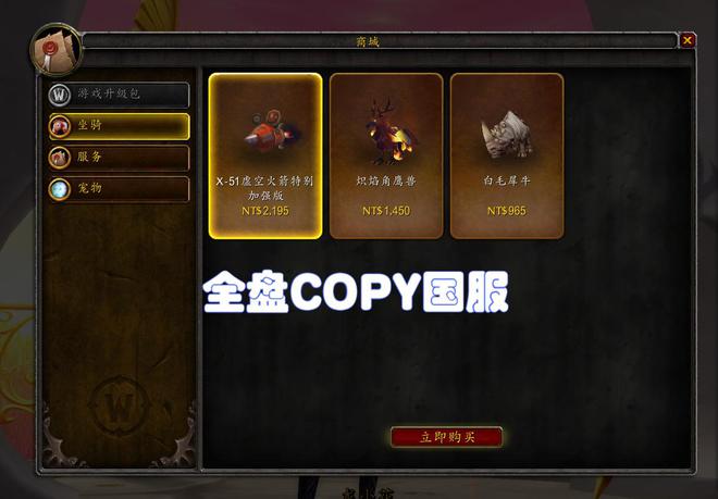 暴雪把许多最初提供给个国服的独家服务,如直升服务和时光徽章,迁移到亚服提供。这一次,他们将提供坐骑和小宠物。坐骑有虚空火箭、角鹰兽和白毛犀牛。其中最昂贵的坐骑价格约为400元。然而,我们不推荐购买虚空火箭,因为它的外观无法与收藏者火箭以及爱情火箭相比较。看起来普普通通的火焰角鹰兽很不错!