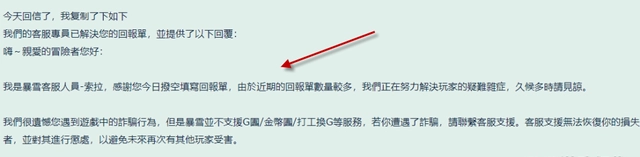 然而,亚服不是国服,这里的规则与我们完全不同。当有人联系在一起时。GM填写表格报告后,回复是——首先,由于最近有大量信息,客户服务无法处理,请耐心等待结果;然后,很遗憾你在游戏中遇到了欺诈,但暴雪不支持G、金币或工作G等服务,请继续联系客户服务。这个回复让每个人都很酷,不要追回金币,因为副本欺诈甚至没有标题处罚。