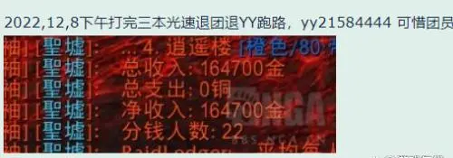 坐标亚服伊弗斯,不止一个玩家遇到了G团黑金,这才是真正光明正大地黑掉所有副本收入,然后逃跑的行为。团长是典型的排骨法师,名字繁体“圣墟”。打完三本书,总收入164700金,在亚服是一笔巨款,按金价转手就能卖很多钱。结果分G的时候,负责人直接溜走了。按照国服的流程,其他人填表,金币很快就能追回来,负责人也能被封号。