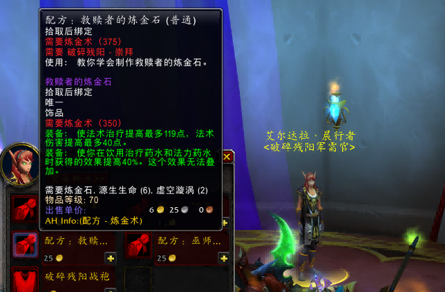 治疗职业是打破残阳的声誉和刷魔术导师平台,目的是打破残阳军需官崇拜治疗炼金石图纸,因为治疗炼金石是TBC所有奶妈职业毕业配件,虽然奶妈可以通过普通模式无限刷声誉,但毕竟YX平台可以摩擦品牌,奶妈职业或每天刷。