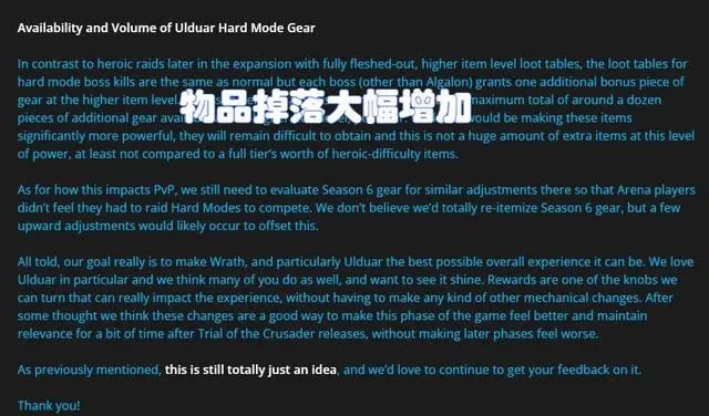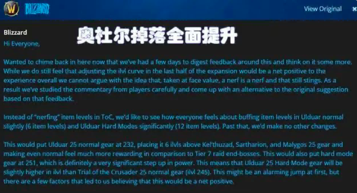 蓝贴中提到了暴雪“我们想看看每个人是对的。奥杜尔普通模式(+6物品等级)和Ulduar困难模式显著提高了物品等级的感觉(+除此之外,我们不会做其他改变。”