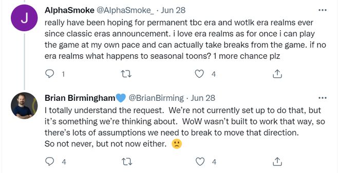 近日,有粉丝在推特上向暴雪魔兽世界总策划BrianBermingham提文有关永久性70和永久80的问题,他对于此事做出了一些回应。