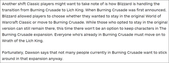 在在今年的4月份IGN对妖兽精英团队的访谈中,在谈及到有关如何才可以TBC怀旧服向WLK怀旧服过多的难题的情况下暴雪就确认过不容易有永久性70服务器。