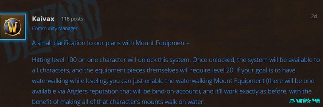 看了以上三件坐骑装备大家是不是觉得还不错呢?不过暴雪对于坐骑解锁的条件进行的说明却引发了玩家吐槽,一开始暴雪的说法这些装备的解锁条件是玩家需要达到100级,消息一出就受到了全球玩家吐槽因为玩家不能接受。对于那些练小号的玩家并没有帮助,他们想要快速升级却无法解锁水上行走是一件非常尴尬的事情。而针对此事暴雪也在积极寻求解决方案并在蓝贴中进行了澄清。
