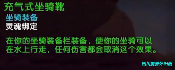 第二种就是可以水上行走的充气式坐骑装备,有了这件装备玩家就可以完美的解决水上行走的问题了。那么对于已经刷过垂钓翁声望并兑换了水黾的玩家来说,新版本将会取消水黾的水上行走能力。暴雪也给出了相应的补偿方案,那就是8.2版本玩家上线后给这些玩家免费提供一份水上坐骑特效装备。由于装备是绑定后使用所以想要更换坐骑特效就得重新进行装备,而水上行走装备将会在垂钓翁声望兑换处进行购买,费用大概在1000金币左右,所以频繁更换坐骑特效的玩家一定要悠着点。