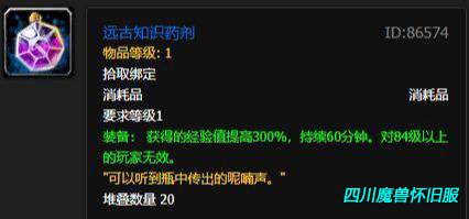 不知道大家是否还记得在MOP版本中有一瓶非常神奇的药水,它的名字叫做远古知识药剂。经历过MOP版本的玩家应该在永恒岛上都获取过这些药剂,初次之外在恐惧废土的长城边上,坐标355 66附近,“利刃”科罗尔也会掉落同样神奇的药水。