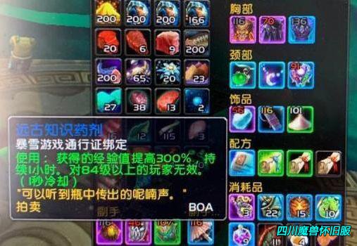 这种药水最大的特点就是能够为玩家提升升级所需经验300%的加成,虽然远古知识药剂的说明说明确标注了使用等级在84级以下,最重要的是这个药剂目前已经绝版,不过好在该物品是账号绑定可以转给自己的小号使用,如果实在没有可以去黑市上淘一淘,不过价格可能就会贵上很多了。很多玩家表示既然药水有等级限制那么如何帮助110级小号升级呢?