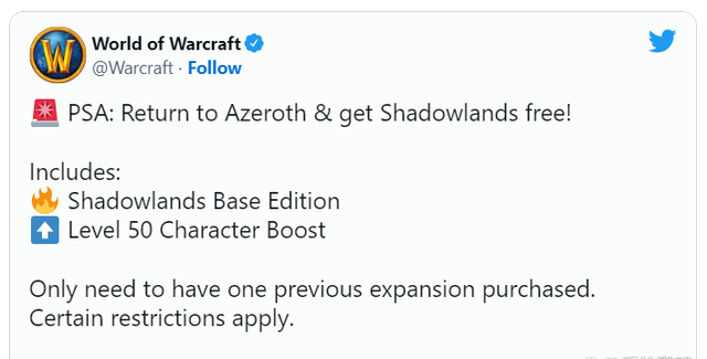 随着魔兽世界10.0巨龙时代的到来,暴雪在美服上召唤老玩家:WOW用户将免费获得9.0暗影国度资料片基本版及角色直升服务。奖励截止日期为9月5日。、