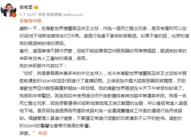 事情是这样的,BBC在工作之余,也玩魔兽世界怀旧服,因为国服即将关停,所以他转入了亚服,新建了一个DK。结果,他用这个DK角色去斯坦索姆刷了几次DK马,就被系统无情封号了。显然系统的自动检测机制把他当成脚本处理,用DK刷DK马,在亚服可是一件无比危险的事。遭到误封后,BBC在亚服申请解封无果,只好向暴雪发邮件进行申诉,并告诉暴雪自己还是暴雪嘉年华多年的中文主持人,封号能不能不要这么随意?