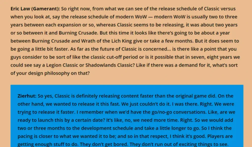 这一次,Blizzplanet网站采访了设计师Kriszierhut和Brianbirmingham。这两个人对我们来说并不重要。一个是系统设计师(规划),另一个是软件设计师。因此,这两个人的回答可以更好地代表暴雪或魔兽世界的未来发展路径。然而,从规划者的回答中可以看出,一个共识是,魔兽世界怀旧服装的速度将加快。