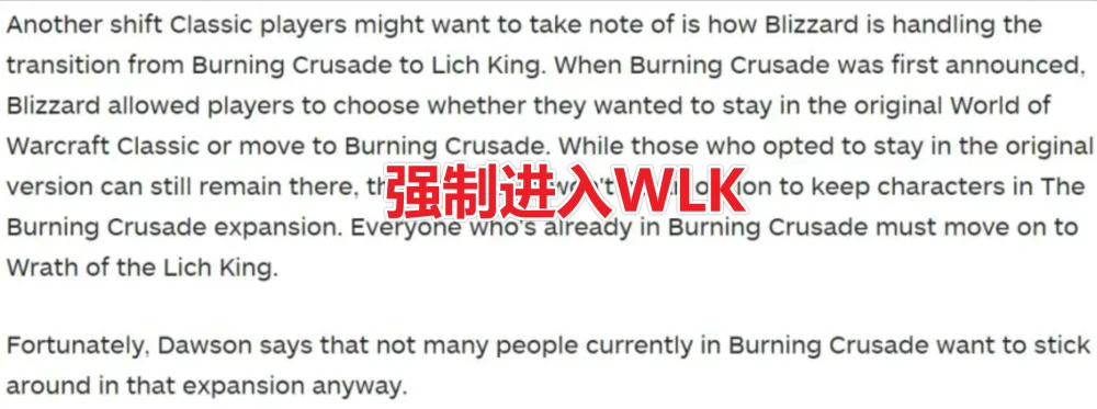 然而,这位官员在开发WLK怀旧服装时非常照顾国家服装玩家。由于时间问题,国家服装版本的进度有点跟不上,因此国家服装玩家没有经历过自然灾害入侵。这位官员说,前夕阶段将持续三周,因此玩家可以弥补他们没有经历过这个阶段的遗憾,估计很多玩家会选择在这个阶段返回。另一个是WLK也将分为五个阶段,类似于TBC,但时间会更快。