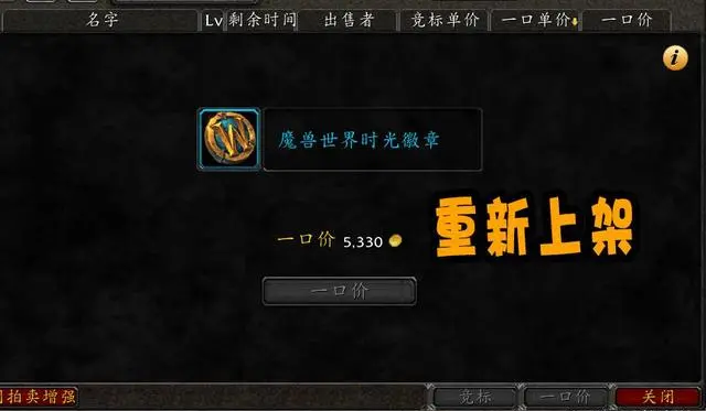 玩家已经知道国服魔兽世界即将关闭的消息,看过网易发布的关闭公告,也应该知道国服战网这两天已经停止了所有与游戏时间相关的充值服务,游戏中拍卖行的时光徽章服务也暂时停止。然而就在CD更新后,玩家意外发现时光徽章又上架了。