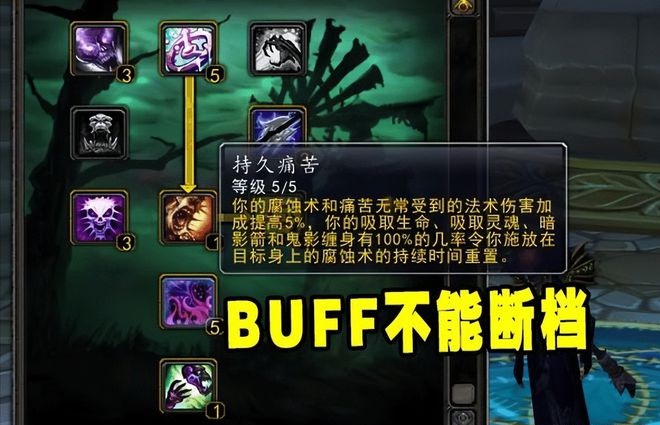 因为痛苦手术的持久痛苦天赋可以使阴影箭和鬼魂纠缠在一起,并且有100%的机会刷新腐蚀手术,所以没有必要担心腐蚀手术跳得太快,而是需要频繁地悬挂DOT。只要持久痛苦天赋能够稳定地触发,整个过程中只需悬挂一蚀。