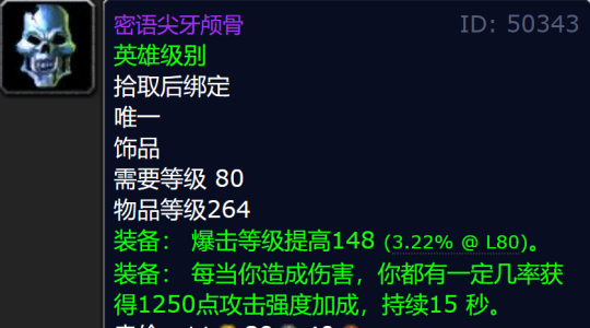 尖牙颅骨作为一款物理毕业饰品,具有一系列强大的属性和效果。首先,它提供了额外的攻击强度和爆击等属性,能够显著增强玩家的输出能力。此外,尖牙颅骨还拥有特殊的效果,可以在使用技能时触发,进一步提升了玩家的战斗表现。这些优势让尖牙颅骨成为了WLK怀旧服P4中备受欢迎的饰品之一。