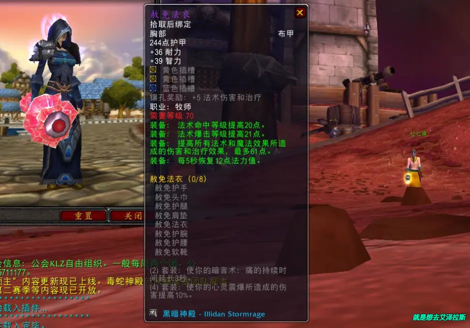 赦免法衣的2件套属性是延长痛的时间3秒,4件套属性是使心灵震爆的伤害提高10%,按照世界第一暗牧,来自于国服霜语的玩家非双丶的游戏数据,痛的伤害占比为28%,2件特效将持续时间从18秒增加到21秒,实际DPS提升为28%*3/18=4.7%;灭的伤害占比为5.7%,4件套提升了10%的伤害,实际DPS提升为0.57%。赦免法衣总DPS提升4.7%+0.57%=5.3%。