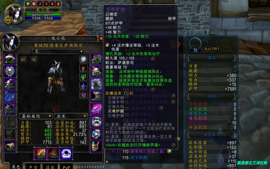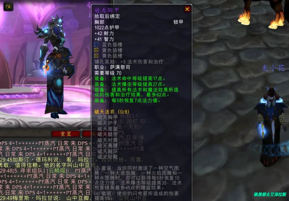 这套装备有利有弊,优点是套装属性强大,2件套提升萨满35法术暴击等级(1.58%暴击)/45点法伤,相当于3%的DPS提升;4件套简单粗暴地提升了闪电箭5%的伤害,闪电箭的伤害占比一般在80%以上,4件套的实际提升5%*80%=4%以上;套装属性综合提升为3%+4%=7%,这个提升真的是非常高了,要知道被网友吹破天的猎人4D3也就6%的DPS提升而已。