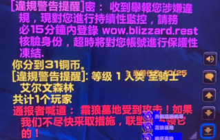 亚服套路是一样的,但可信度却更高一些,大家看骗子的对话——收到举报涉嫌违规,再看这位玩家所处的环境——奥山战场。这年头奥山战场部落全员挂机,联盟则是不允许任何人挂机,都是为了效率升级,所以在战场中有什么异动被人举报很正常。骗子正是看准了这一点,战场里面的玩家比外面的玩家更容易受骗,因为很难说他们不是在挂机、摸鱼。