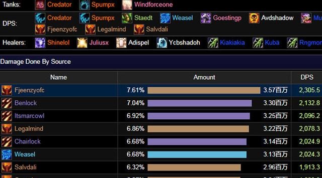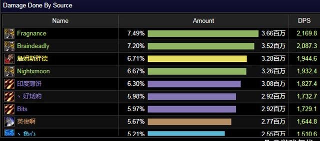 OS没有带来暴力战争,所以兽王猎牢牢占据了DPS的前列,但它仍然被双刀贼强行挤进了前三名,后面是术士大军。事实上,差距很小。Avatar的术士们在双刀战争中赢得了全团第一名,互相咬得很紧。这个团队没有带动兽王猎,只有一个生存猎提供BUFF。Progress带来了四场暴力战争,只有一场生存猎。虽然士兵是第一名,但第二名和第三名都被术士占据。可以看出,这三个职业差距非常有限。目前,最高DPS在双刀战争中处于领先地位,但随着SW设备的改进,差距很快就会消失。